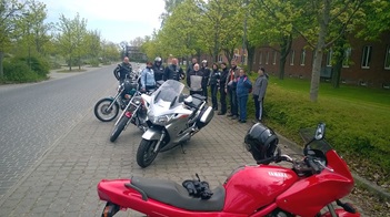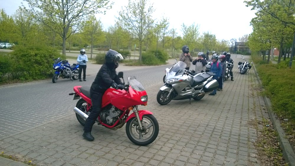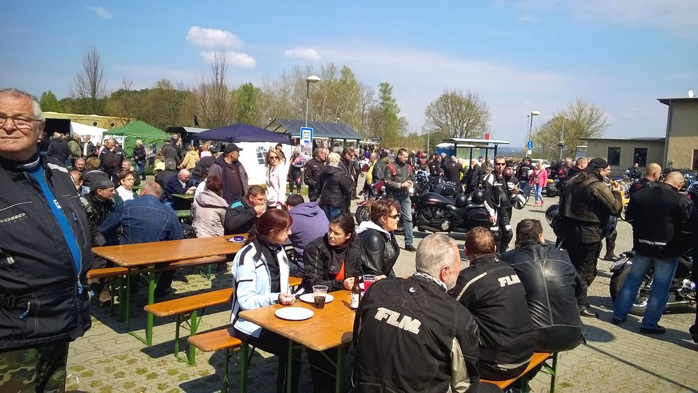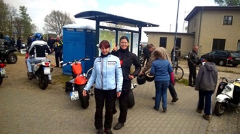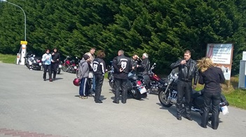 An der Tankstelle vor Lichtenberg haben wir noch einen kleinen Stop eingelegt um einen kleinen Kaffee zu trinken und etwas die Beine zu vertreten. Zum Glück. Bei einem unser Gastbiker hat sich der Benzinschlauch gelöst. Ehe der Fehler bemerkt und behoben werden konnte, hatte sich allerdings eine ganze Menge der kostbaren Flüssigkeit, getrieben von der Anziehungskraft der Erde, in die selbige begeben. Dickes Bike braucht eben viel Sprit, aber sollte er nicht in der Brennkammer landen? (lol)