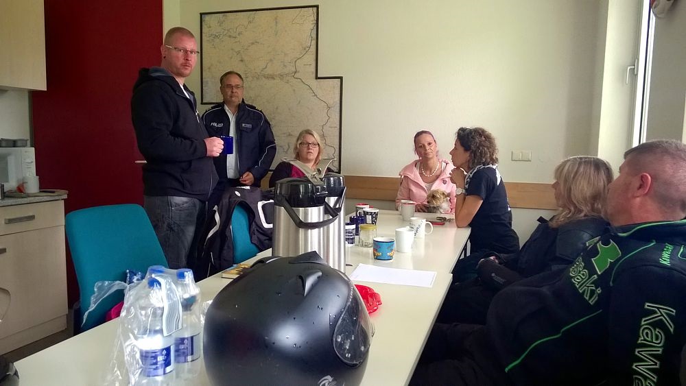 Es hat nicht doll geregnet, aber permanenter Nieselregen über die fast komplette Strecke nervt auch. Die Wasserschutzpolizei hatte einen Tag der offenen Tür und bat uns gleich erst mal einen schönen Kaffee an, der schön durchwärmte.